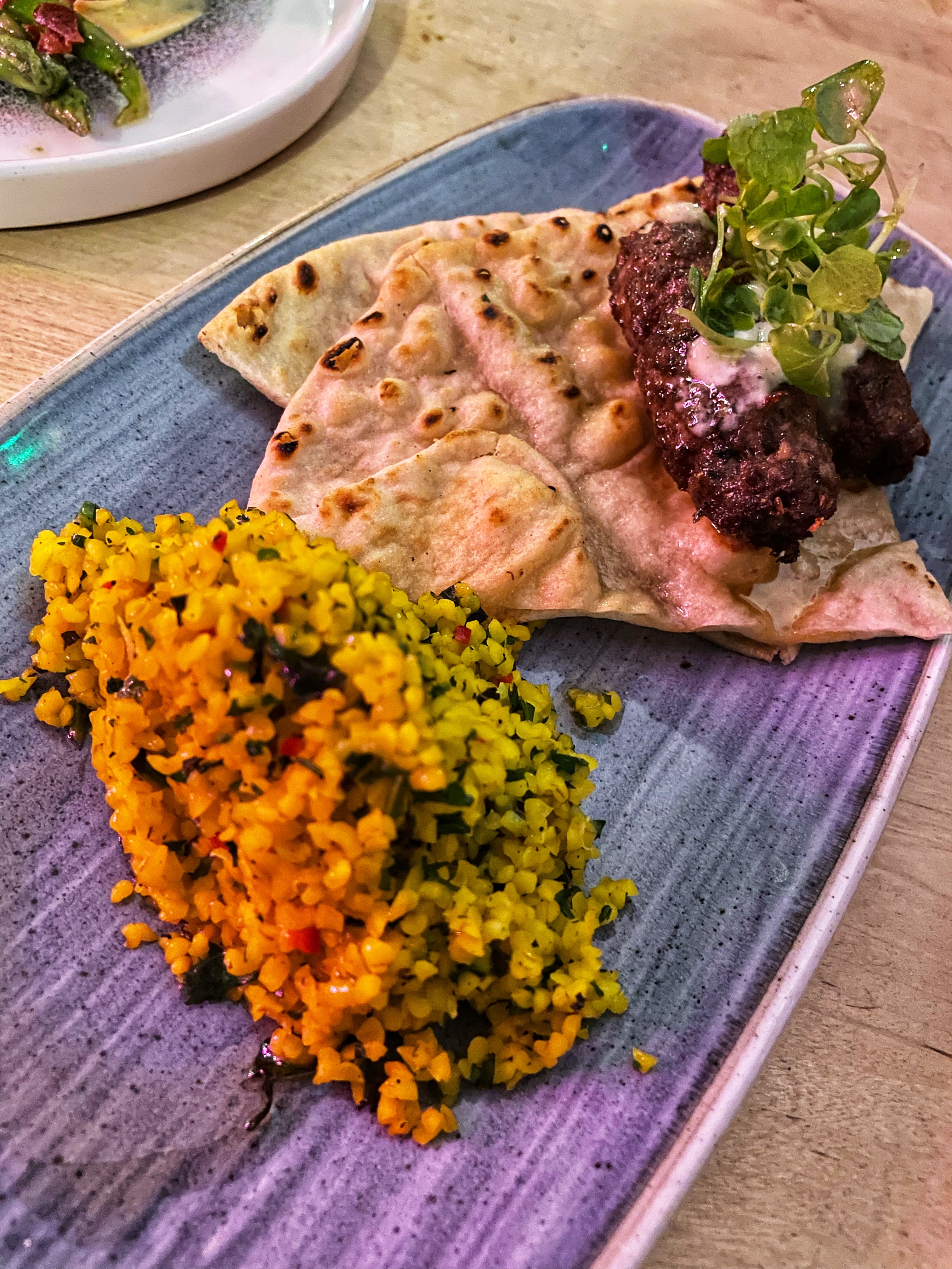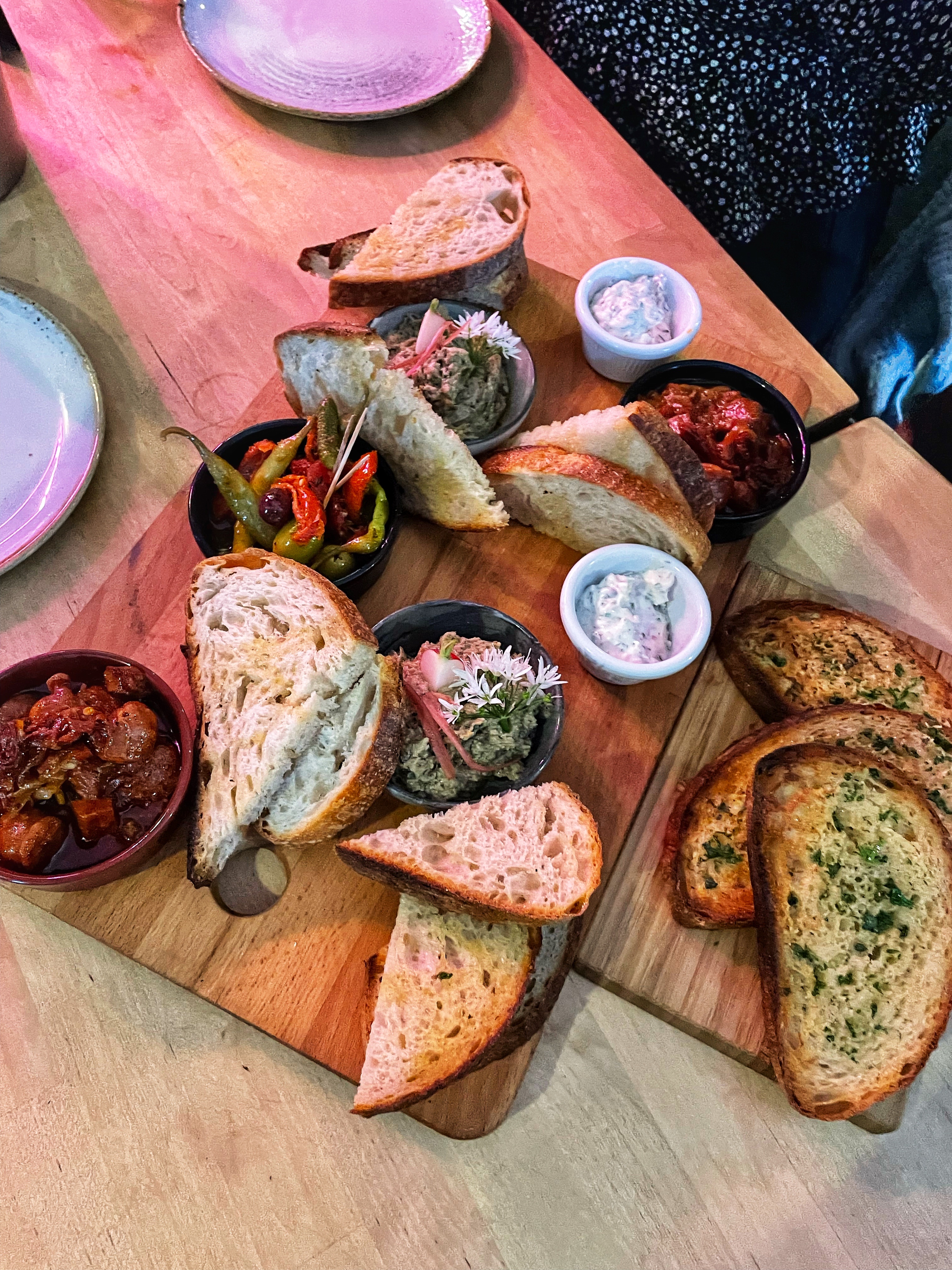 We kicked off with a ‘prestarter’ board which included the sourdough garlic bread, butterbean artichoke and basil hummus, marinated olives and pickles, cockle popcorn and (I kid you not) the best chorizo cooked in cider I’ve ever tasted. The cockle popcorn was the surprise hit for me – I had it a few years ago and hated it (too chewy/fishy) but this was seriously moreish.