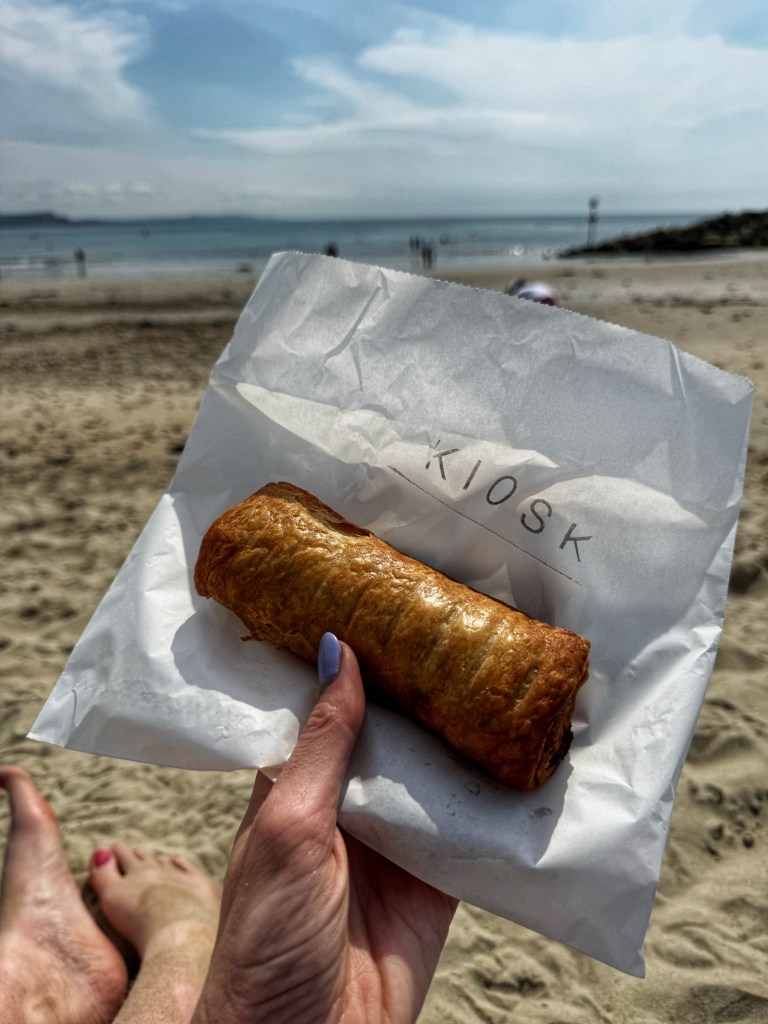 We had a little picnic lunch on the beach consisting of a sausage roll and chocolate hazelnut croissant that we purchased from here.