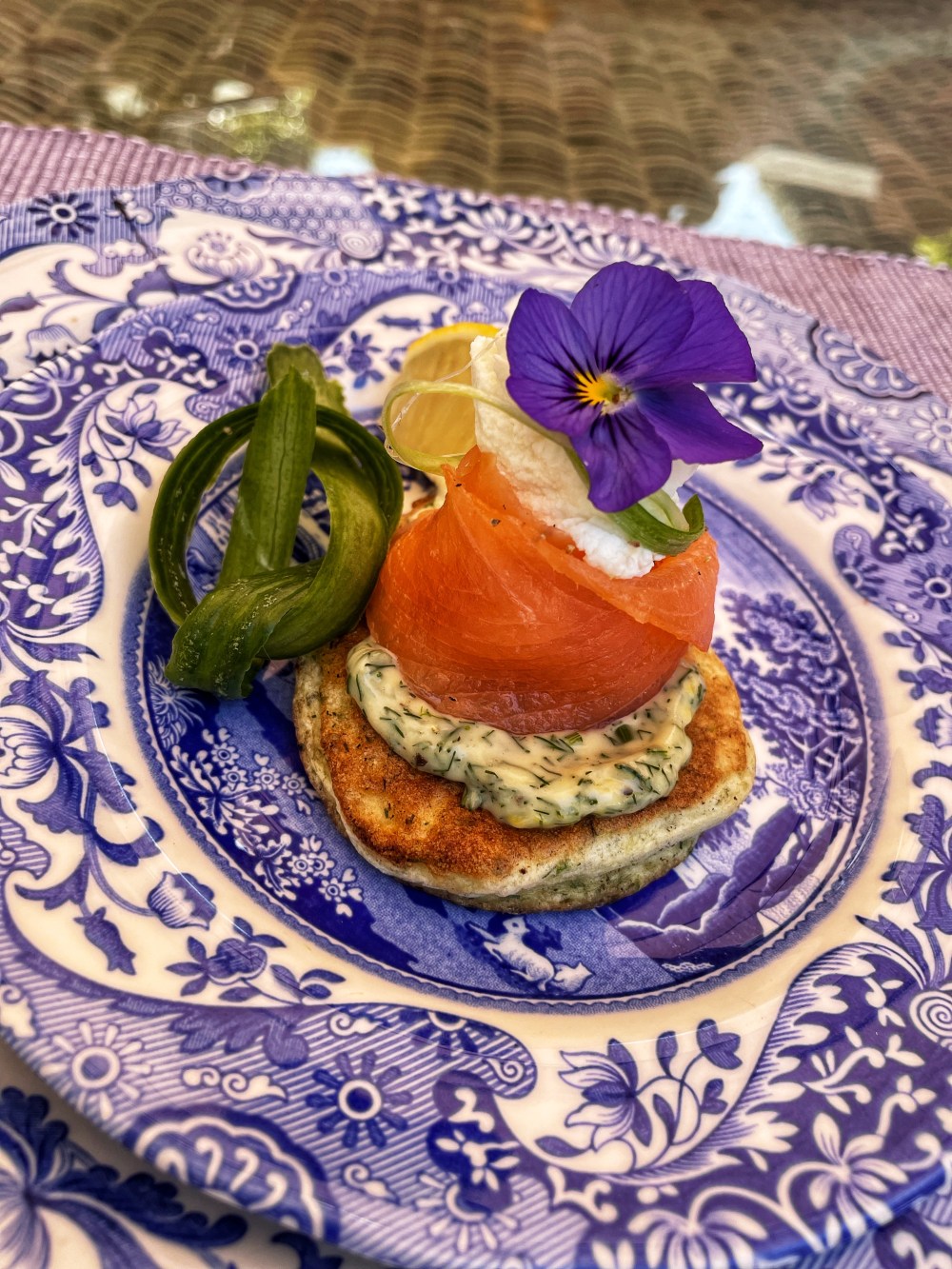 🤍 Smoked Salmon Blinis – fresh smoked salmon on a dill blini with dill mustard mayonnaise