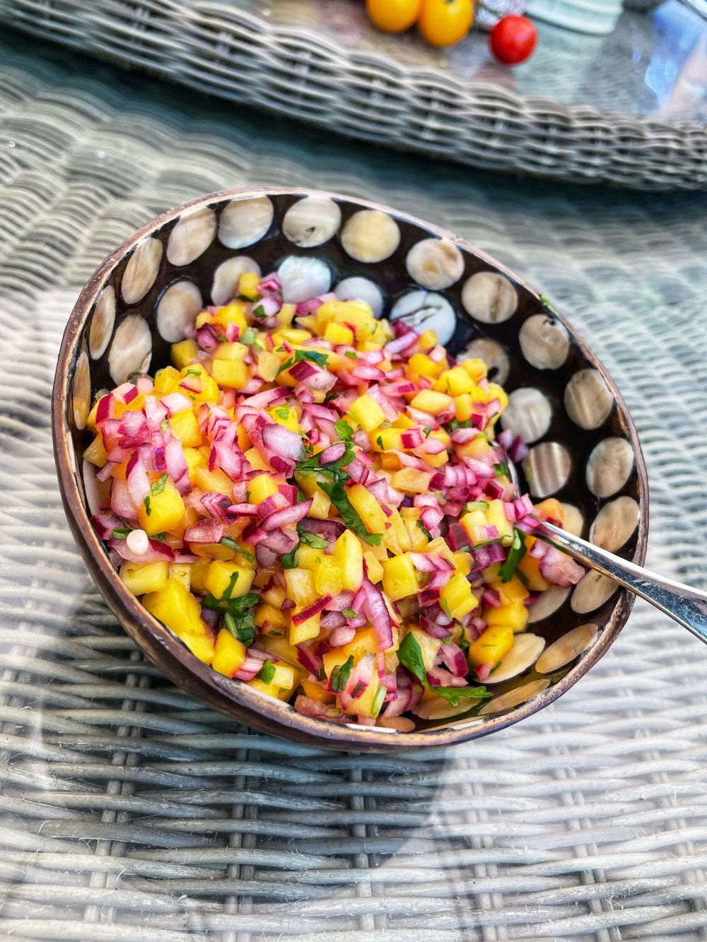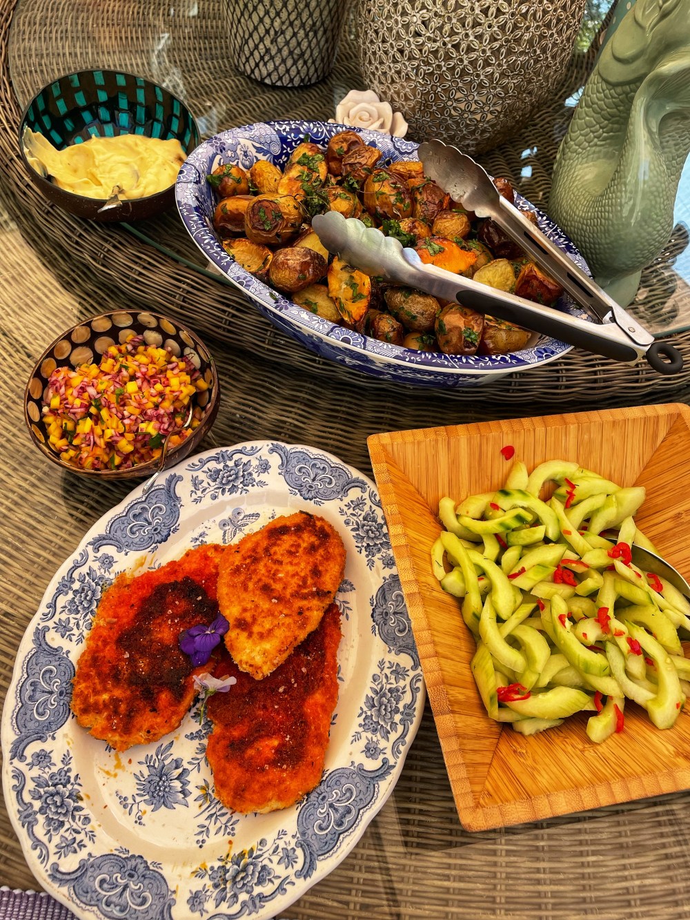 🤍 Chicken Nduja Milanese – corn fed chicken breast with Nduja encased in panko breadcrumbs served cucumber salad, mango salsa and roasted new potatoes