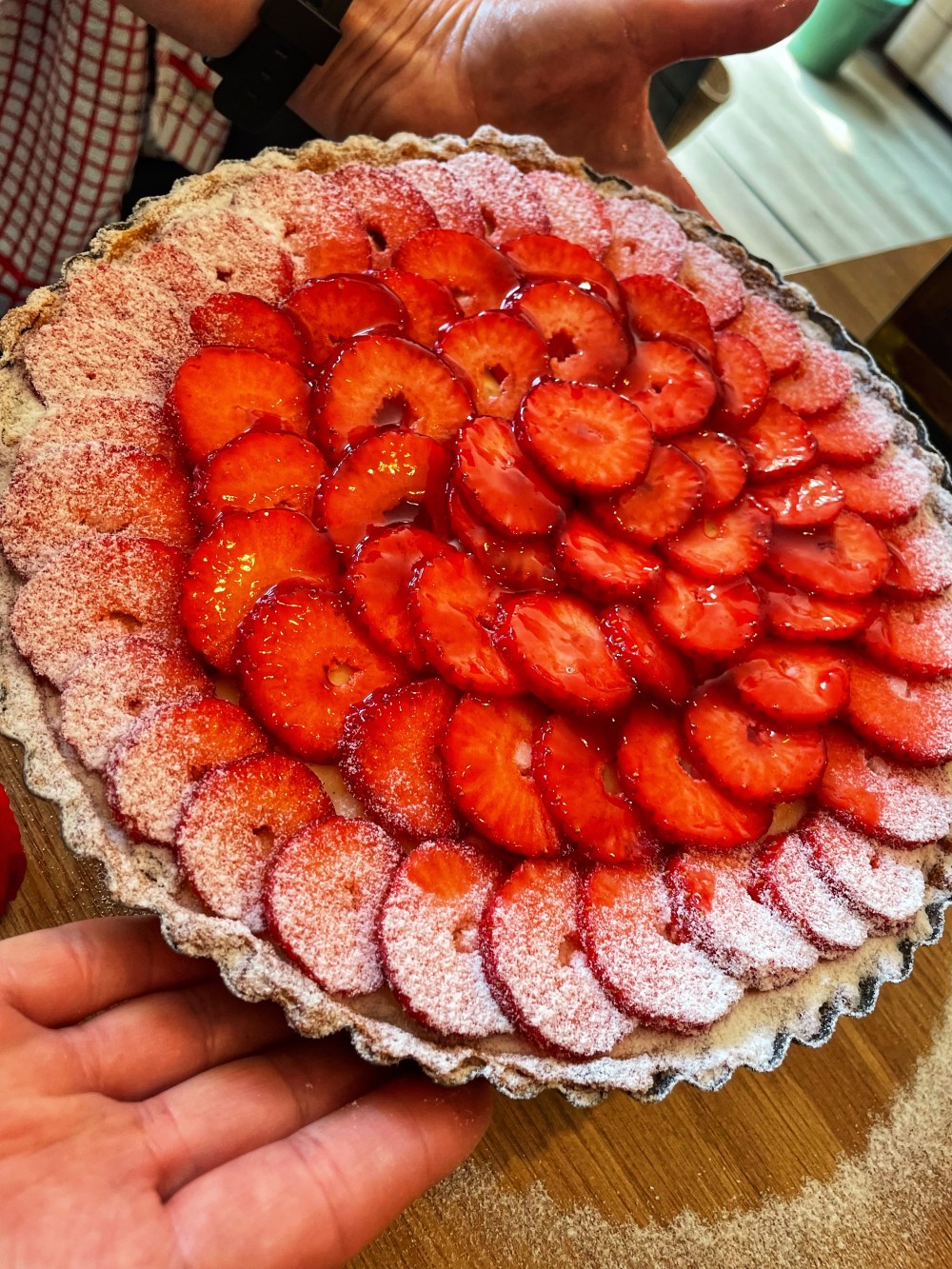 I love strawberries but wouldn’t usually opt for a strawberry tart (longtime readers will know my usual line – what is a dessert without chocolate?! 😆) but even I could appreciate the beauty (and skill) that went into this stunner! (Made all the sweeter knowing the strawberries were from The Veg Box).