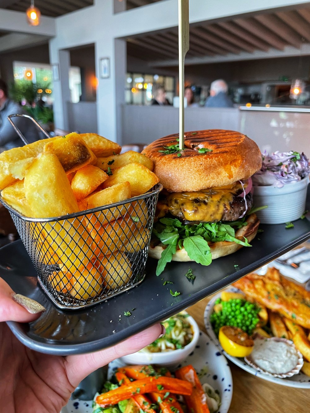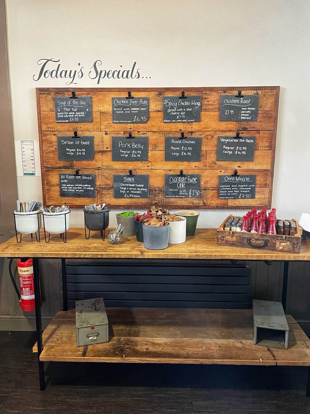 The pub itself has been attractively refurbished. Itās big (400 covers) with lots of natural light (floor to ceiling windows) and also has an outdoor terrace with sunset and suspension bridge views. When ordering, you get drinks at the bar and order food from a separate counter. This gives it a laid back feeling but not an issue for us. Just don’t forget to check out the specials board before heading up with your selections!!