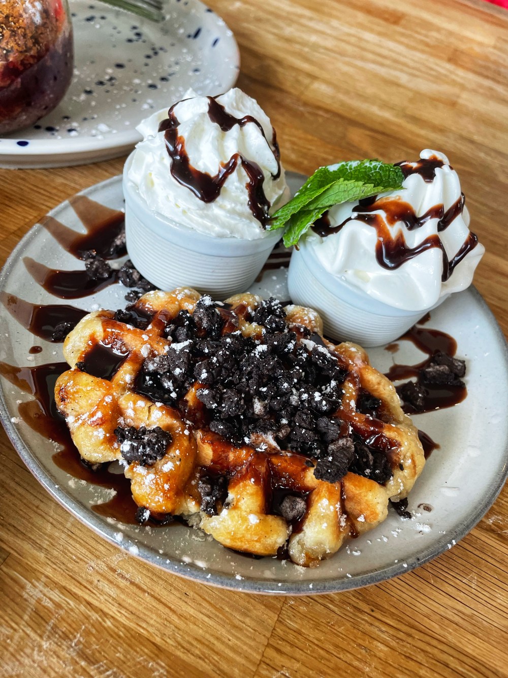 Eldest teen was a greedy guts like me and opted for his own pudding – and now wants to recreate the biscoff crumble at home having enjoyed so much! I nabbed a mouthful of the Oreo waffle (shared by the middle ‘children’ – Dad and T) and was impressed, would consider ordering myself next time. Waffles in the UK I usually find too chewy and obviously reheated, but this one was a nicer consistency tasting fresh and a great combo of toppings.