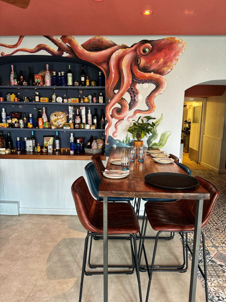Sat in the conservatory we were able to take full advantage of the beautiful blue skies, sunshine and sea views, and when the weather gets warmer the large outdoor terrace would be a great option too. When I eventually shifted myself to have a look at the interior restaurant, I realised it was far lighter than I’d assumed. With the clever use of murals, more tiles (yay), soft furnishings, ambient lighting and cleverly displayed products it was a warm, inviting area and a great alternative area to dine in should the conservatory be full.