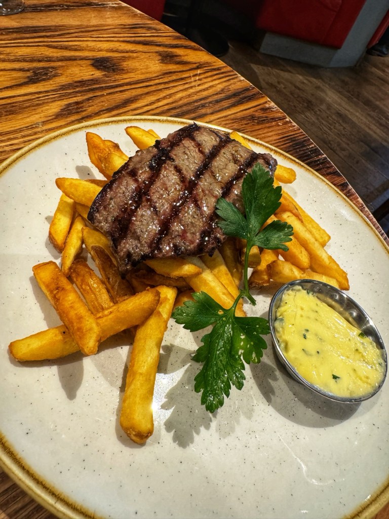 💜 Steak Frites (+£2 Supplement) – 5oz minute steak served pink, garlic butter, skin on fries