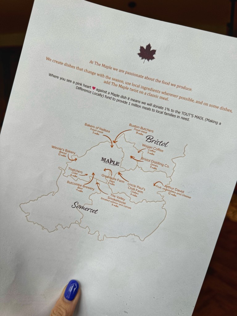 This was a solid roast, and for the surroundings and quality of local produce the price point is fair albeit not cheap (3 courses for 2 adults, 2 course child’s meal, two alcoholic drinks and a soft drink came to £100). Use of local produce is something taken seriously at The Maple, with a map on the back of the menu listing familiar suppliers alongside food miles.