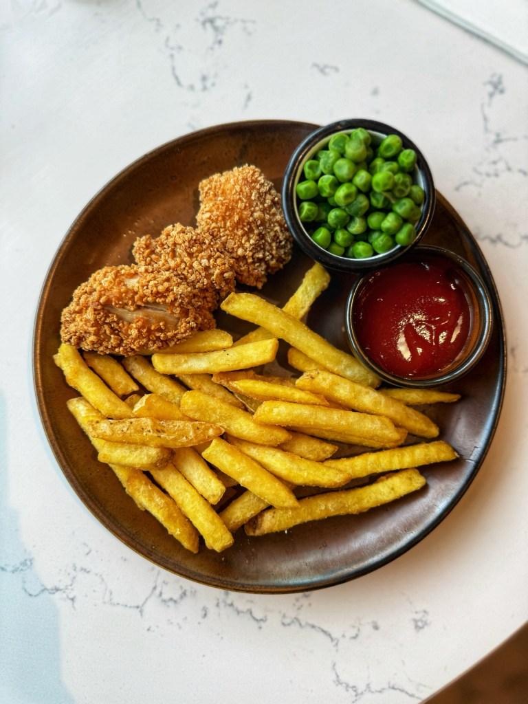 If I’m looking for faults, as a parent I look for kids meal deals but here you have to pay for everything separately (mains £7, dessert £4, drink extra). That said, Bea loved the nuggets (‘the best ever’) and that the menu was a colouring sheet and pencils were provided.